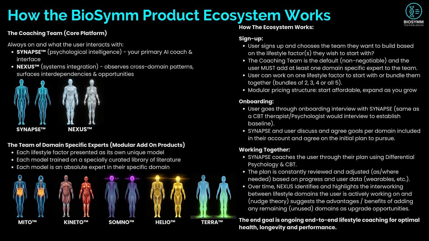Together we are BioSymm Technologies Ltd and we are spearheading AI-based solutions for human metabolic health which solve the execution gap by arming you with a TEAM of expertise not just in the relevant lifestyle factors, but more importantly in setting up systems and strategies for overcoming the chaos of life and associated cognitive dissonance...
